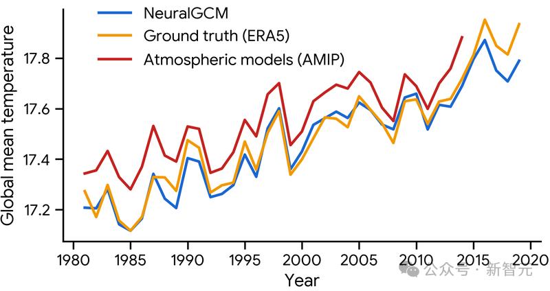 在预测1980年至2020年间的温度时,NeuralGCM的2.8°确定性模型的平均误差,是大气模型(AMIP)误差的三分之一,即0.25 vs. 0.75摄氏度。