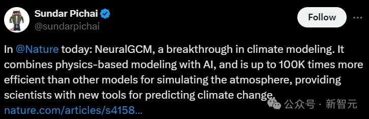 今天一早,谷歌CEO劈柴在X上发布帖子,宣告NeuralGCM在气候建模领域取得了重大突破!