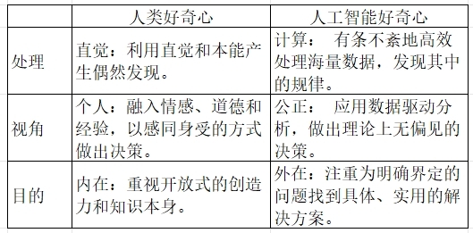 为了理解人类和人工智能好奇心的不同作用,通过一个比较框架来研究它们的独特特征是很有帮助的。这个框架着眼于好奇心的三个关键方面:处理、视角和目的,并研究人类和人工智能在这些方面有何不同。