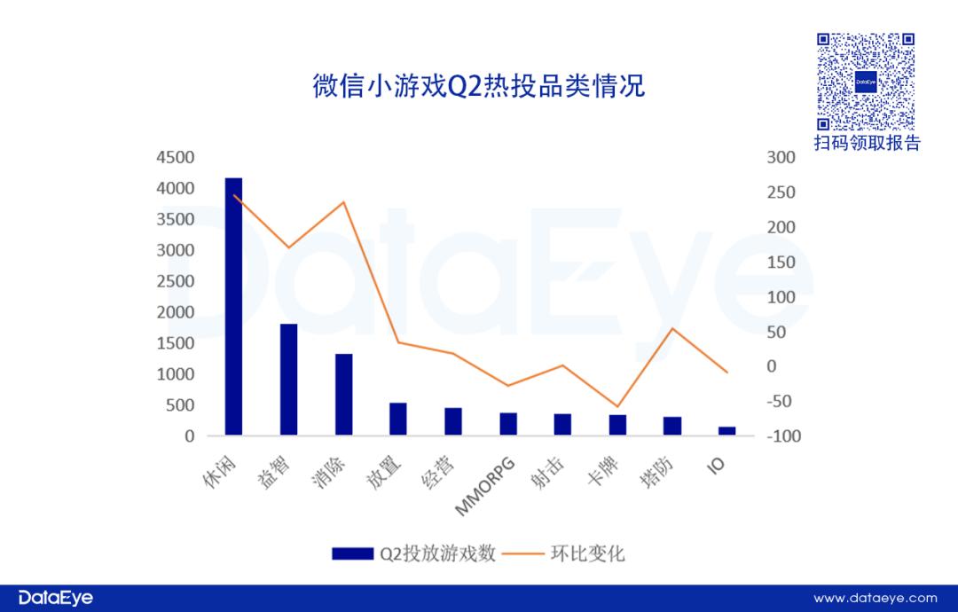 进入Q2,轻度玩法在投游戏数呈现明显增长,休闲+益智合计接近6000款游戏在投。