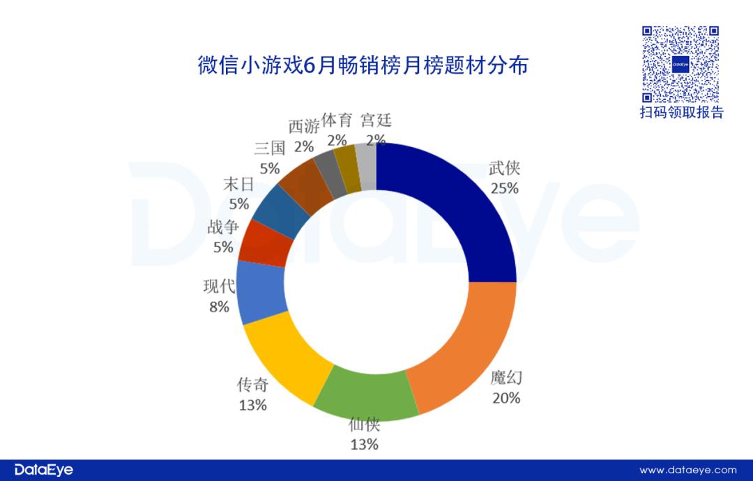 从题材来看,武侠、魔幻为主,传统题材领跑。根据6月微信小游戏畅销榜TOP40的题材分布情况来看,武侠、魔幻以及仙侠题材占比排名TOP3。