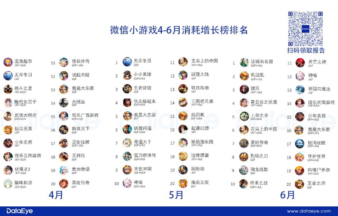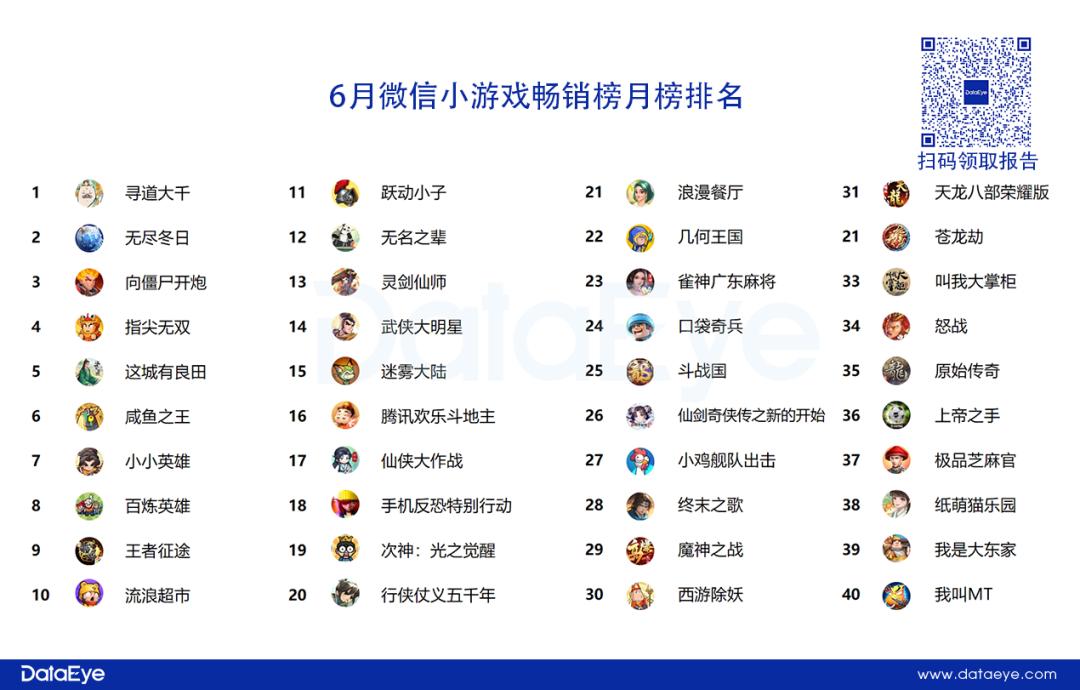 微信小游戏月榜排名根据微信小游6月畅销榜每日平均排名进行排序,月榜TOP40如下: