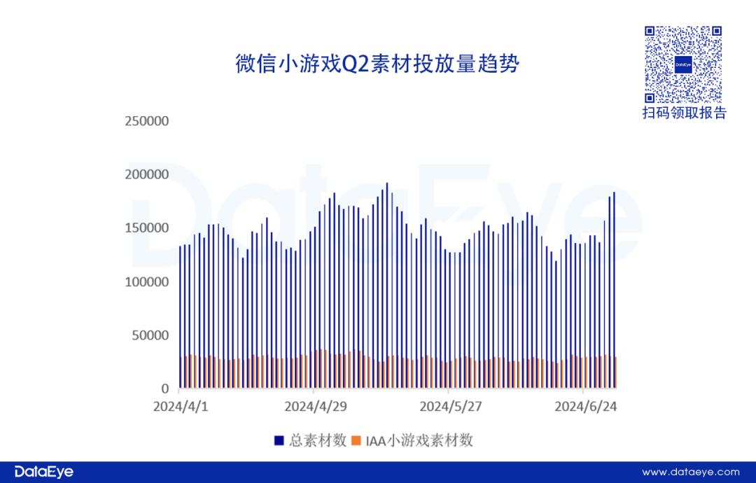 从投放素材量来看,Q2日均投放素材量为14.96万,环比Q1下滑约6.7%。其中IAA小游戏日均投放素材仅为2.9万条,占比大盘不足20%。