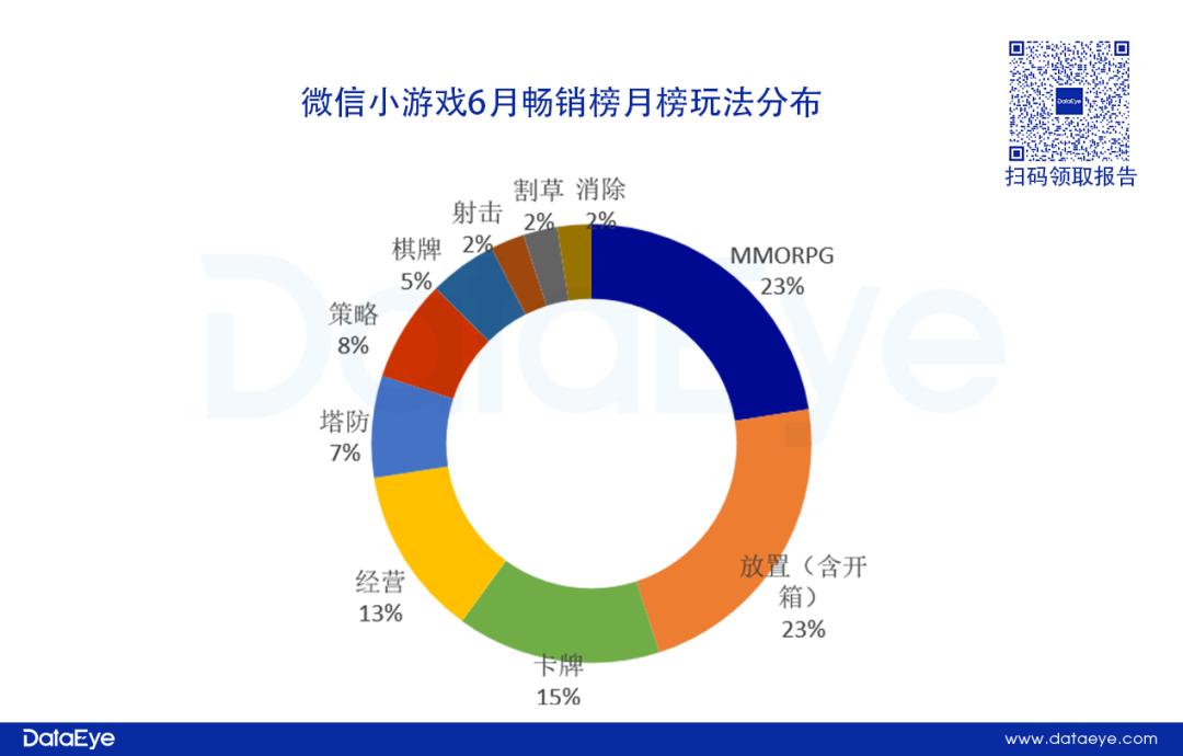 从玩法来看,MMORPG和放置(含开箱)领衔畅销榜。根据6月微信小游戏畅销榜TOP40的玩法分布情况来看,MMORPG、放置(含开箱)以及卡牌玩法占比排名TOP3,三者合计占比约为61%。
