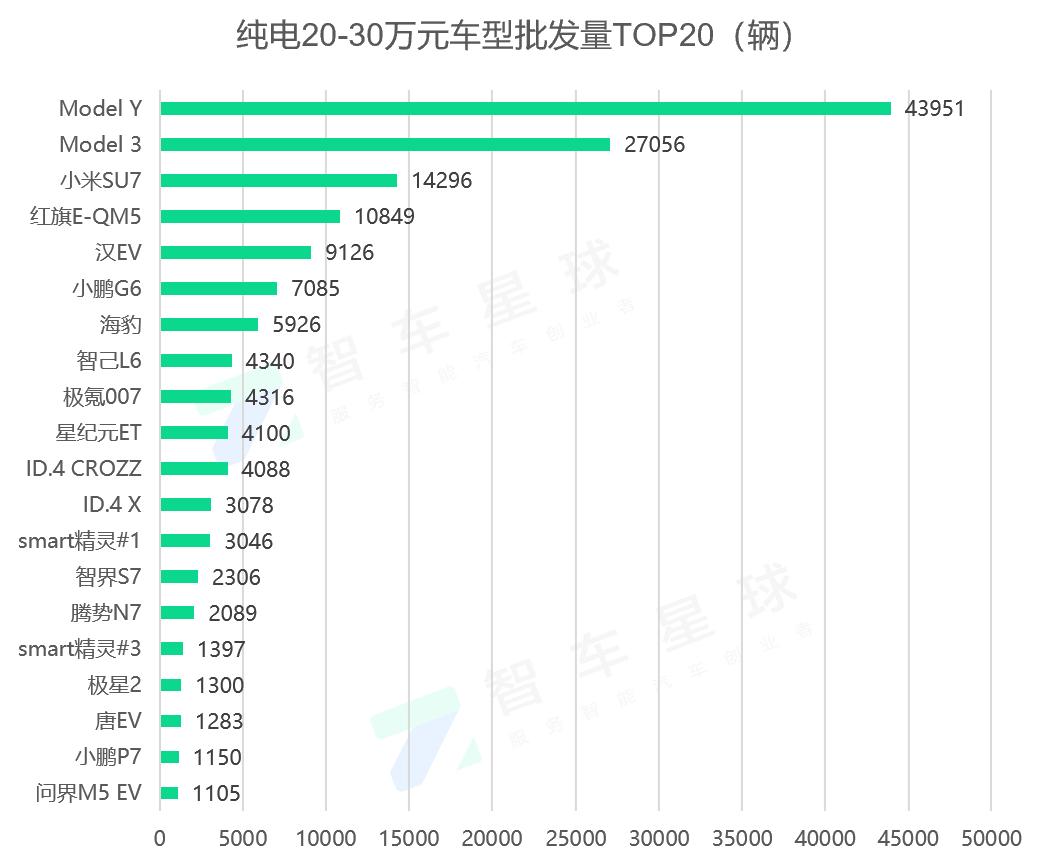6月的纯电20-30万元市场,小米SU7也加入了单月批发量破万的队伍。从有批发量数据录入的4月开始,小米SU7的累积批发量达3万辆。