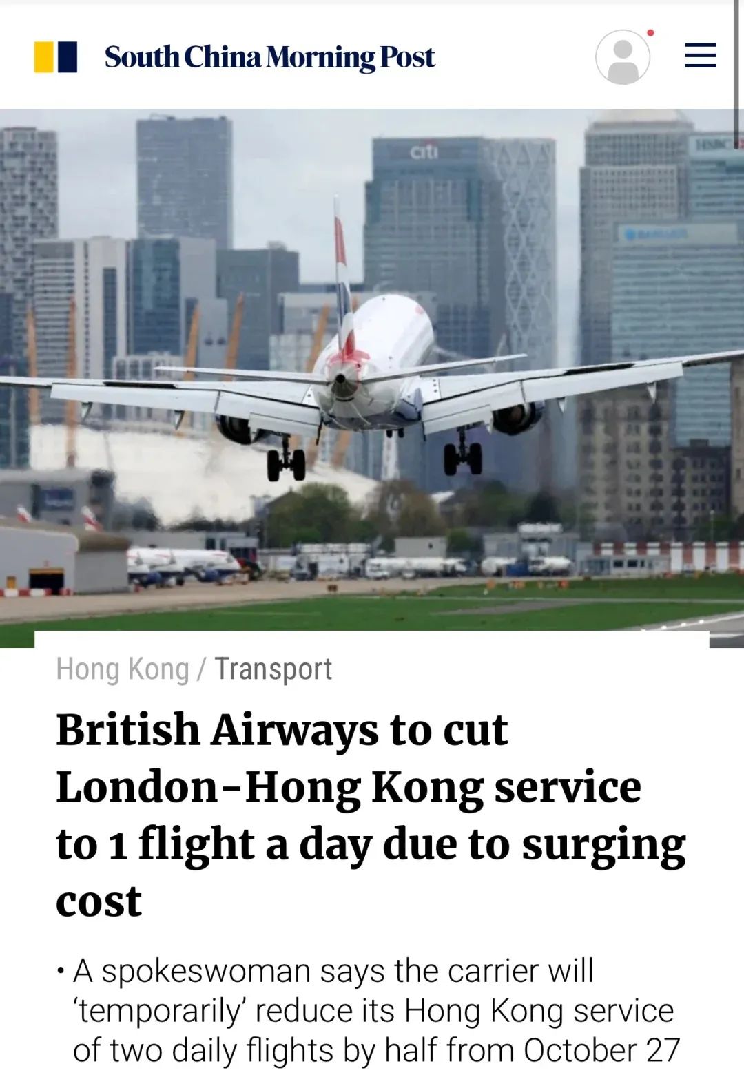 英国航空公司也在解释砍半香港航线时透露,由于俄罗斯空域限制导致该航线运营成本飙升。