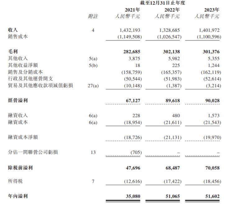 业绩方面,2021年、2022年和2023年,宏信超市分别实现收入约14.32亿元、13.29亿元、14.02亿元,存在一定波动;相应的净利润分别为3508万元、5106.5万元、5160.2万元;同期毛利率分别为19.7%、22.7%、21.5%。