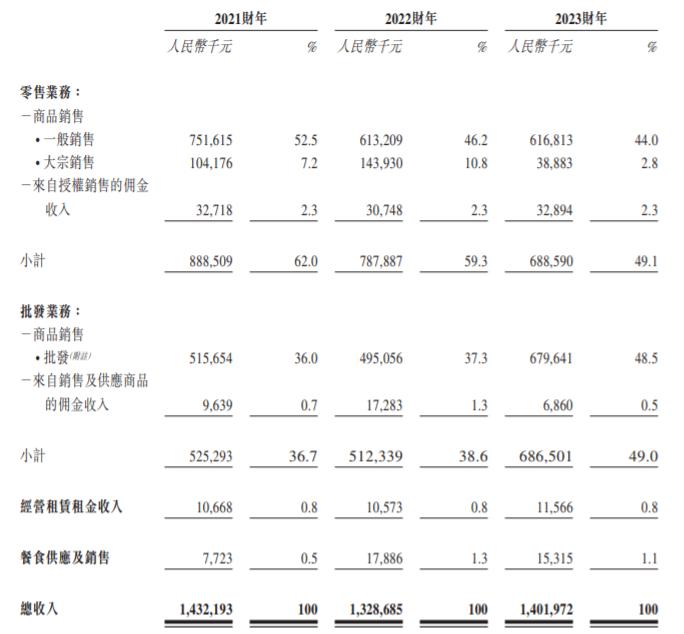 批发零售业务在期内的营业收入占总营收的比例分别为36.7%、38.6%以及49%,呈现逐年升高的趋势,甚至即将超过零售业务成为公司的第一大业务;至于经营租赁租金收入、餐食供及销售收入占总营收的比例较低且较为稳定。