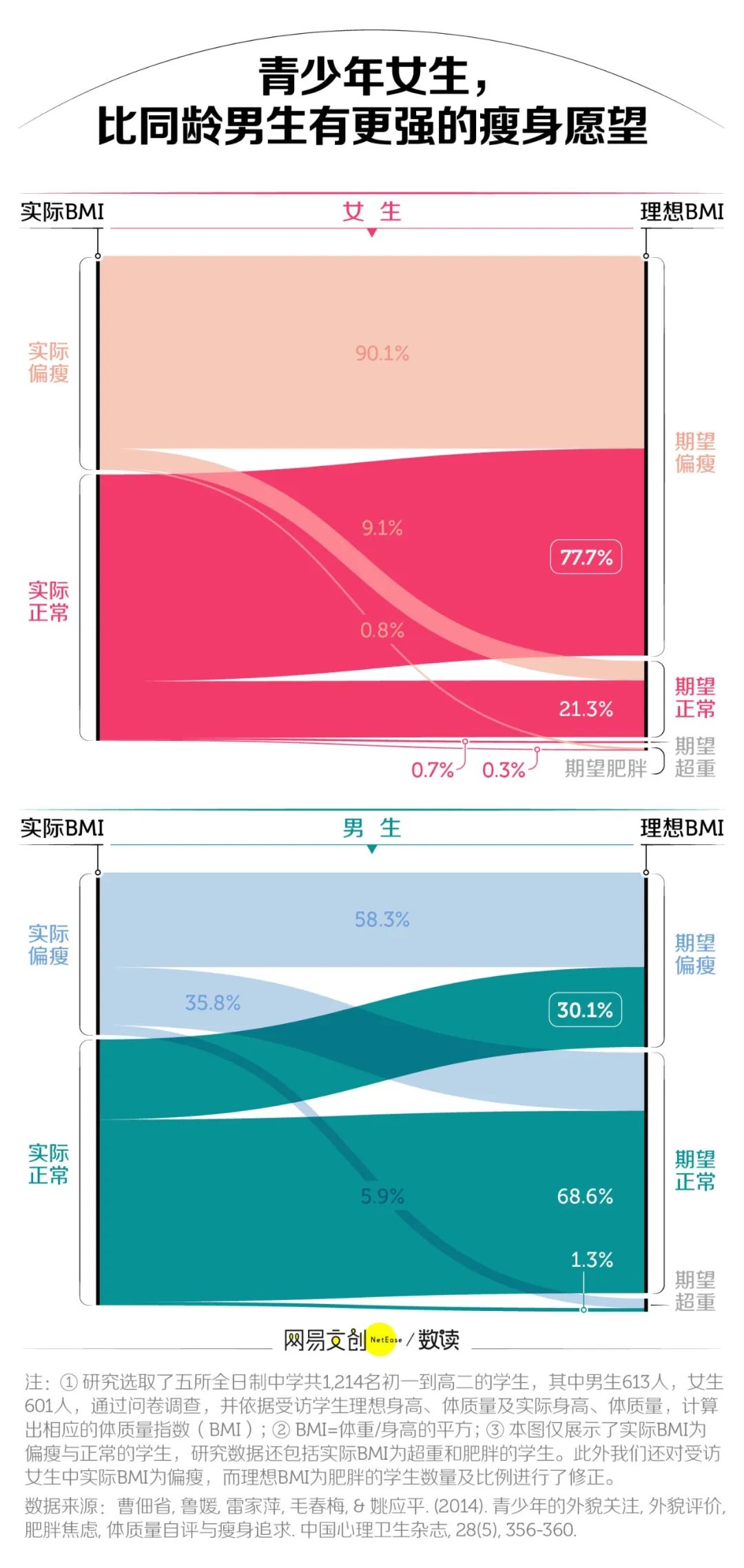 另外一项针对江苏扬州 1214 名初一到高二学生的研究发现,比起男生,女生对瘦的欲望更强烈。参与调研的学生中,有 79% 的女生都想要拥有偏瘦的身材,而男生这一比例仅为 36. 1% [7]。