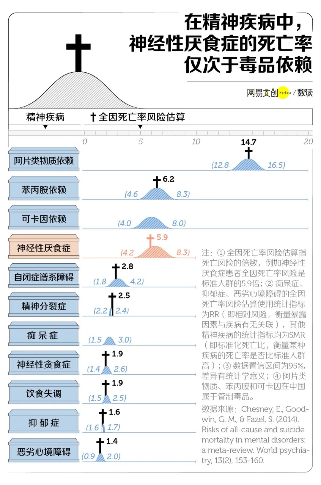 这并非孤例,厌食症的确是死亡率风险最高的精神疾病之一,仅次于阿片类物质等毒品依赖 [3]。