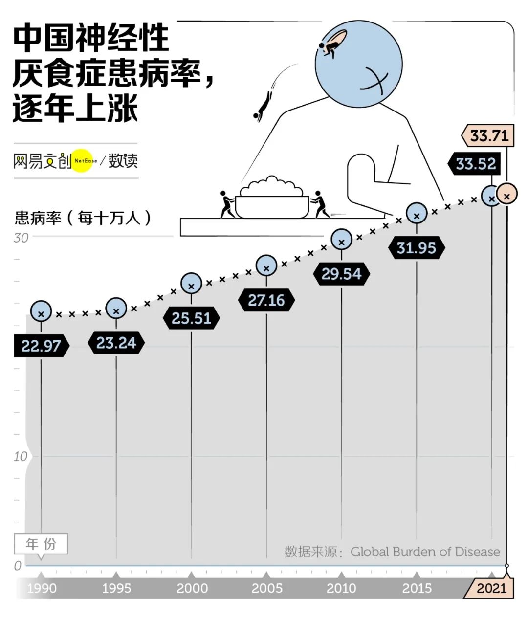 根据 Global Burden of Disease(全球疾病负担,下文简称“GBD”)的数据,中国厌食症的患病率从 1990 年每十万人中有 22.97人 罹患,增长到 2021 年的 33.71 人。如果结合中国人口总量推算,仅 2021 年就有超 47 万国人饱受厌食症折磨 [4]。