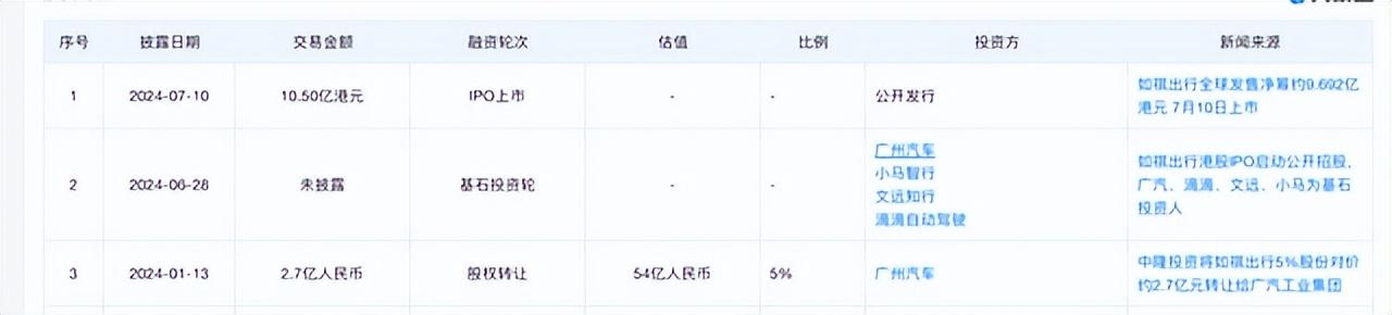 天眼查APP融资信息显示,1月份如祺出行曾以5%的股份对价转让给广汽工业集团。当时的估值是54亿人民币。