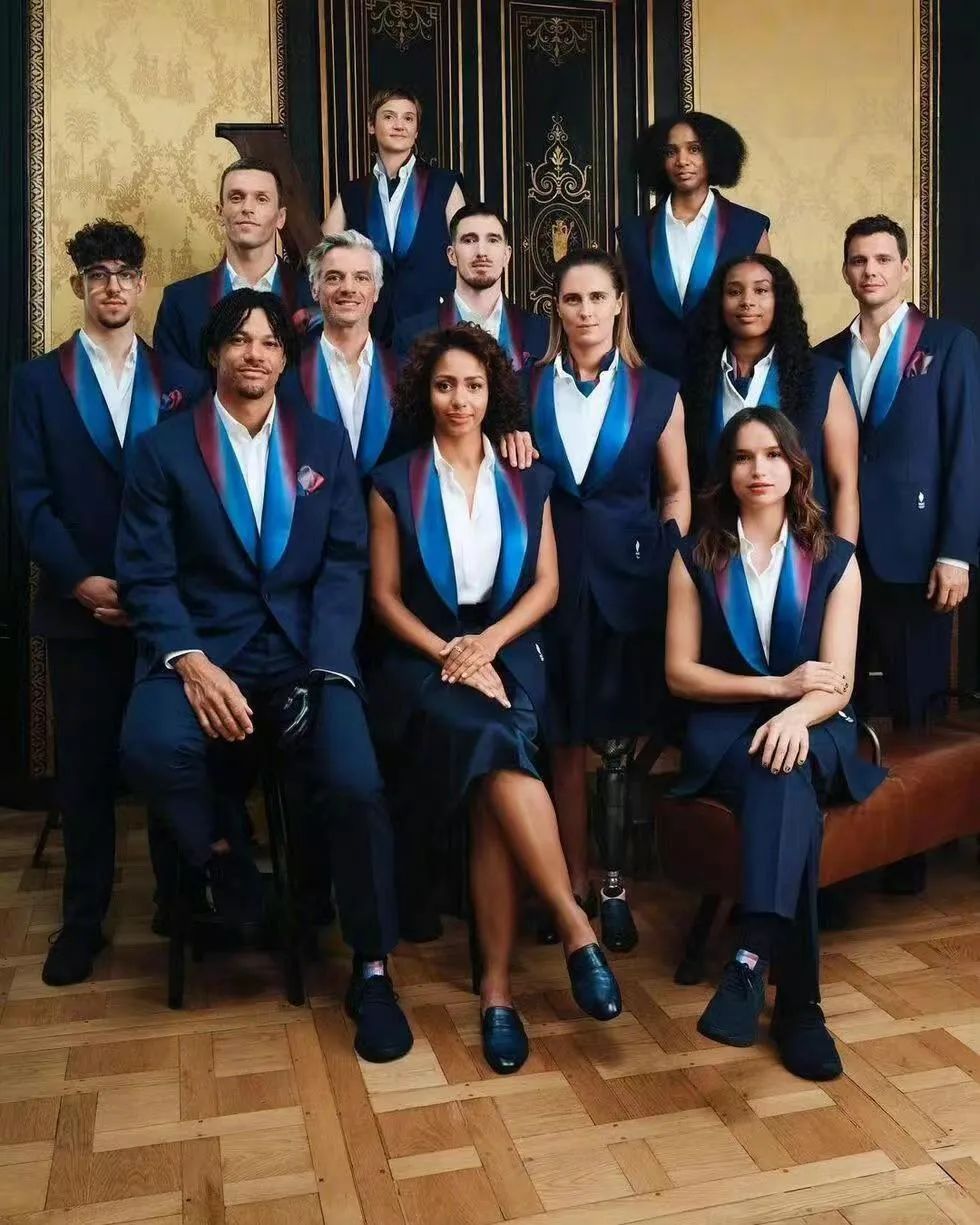 法国队开/闭幕式服装,由LVMH集团旗下擅长皮革工艺的精品品牌Berluti设计,看起来老钱满溢。