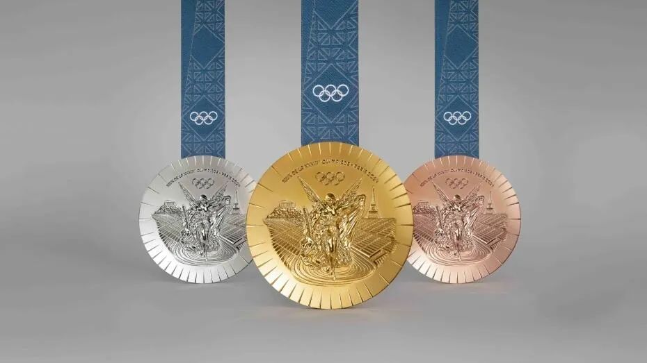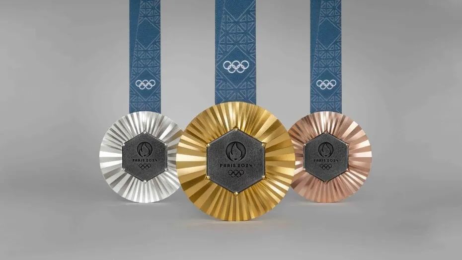 奖牌的设计,交给了LVMH集团旗下的珠宝及奢华腕表品牌CHAUMET(尚美巴黎)。 他们将传统、体育和珠宝三者结合起来,把代表法国的六边形、代表“光之城”巴黎的光芒,和代表埃菲尔铁塔的原铁镶嵌完美融合。