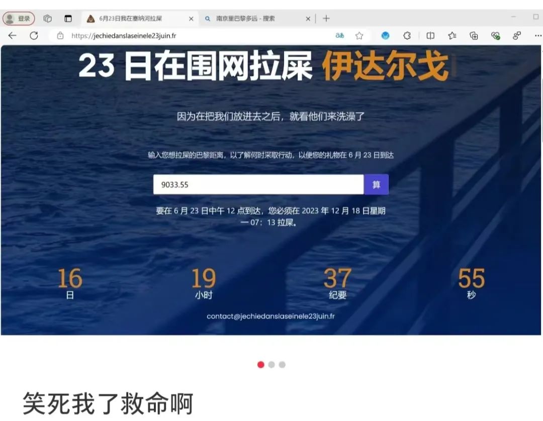 还专门建立了一个网站,输入距离,你就可以知道你的便便什么时候到达巴黎,便于不在巴黎的法国人计算时间拉屎,好让它们在6月23日(法国总统马克龙和巴黎市长原定一起畅游塞纳河的日子)准时抵达塞纳河。