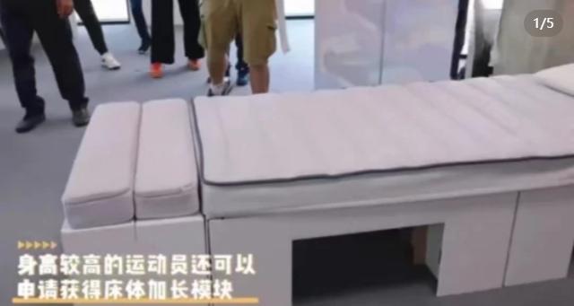 运动员们睡的床,延用了东京奥运会的纸板床,每张床都是由两张纸板组装成的。标准长度是90cmx200cm,如果身高“超标”了,得申请添加床体加长模块。