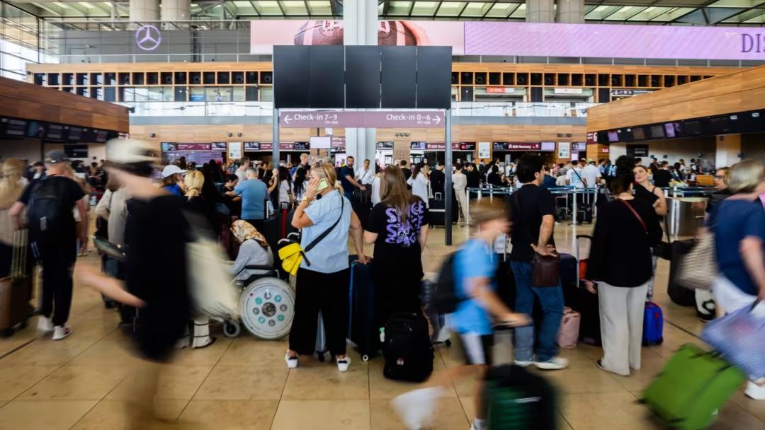 在德国柏林勃兰登堡机场,乘客们因为设备故障进不去安检口。