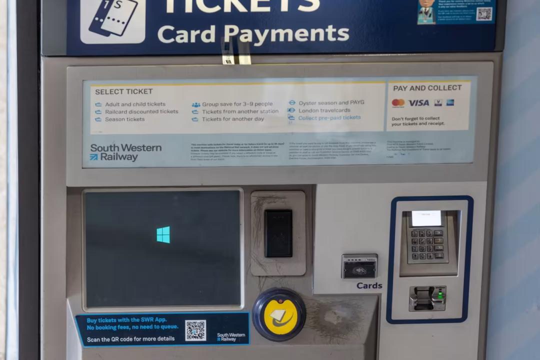 伦敦车站的售票机蓝屏,导致人们买不到车票。