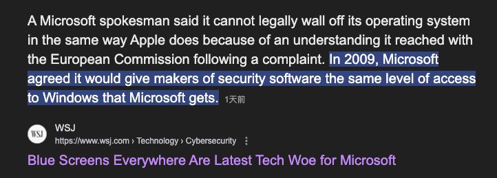针对这点,之前微软顺势跳起来吐槽欧盟说: “ 当年就是它让我向安全软件开放底层权限的。 ”