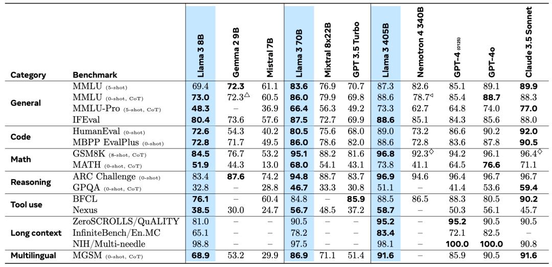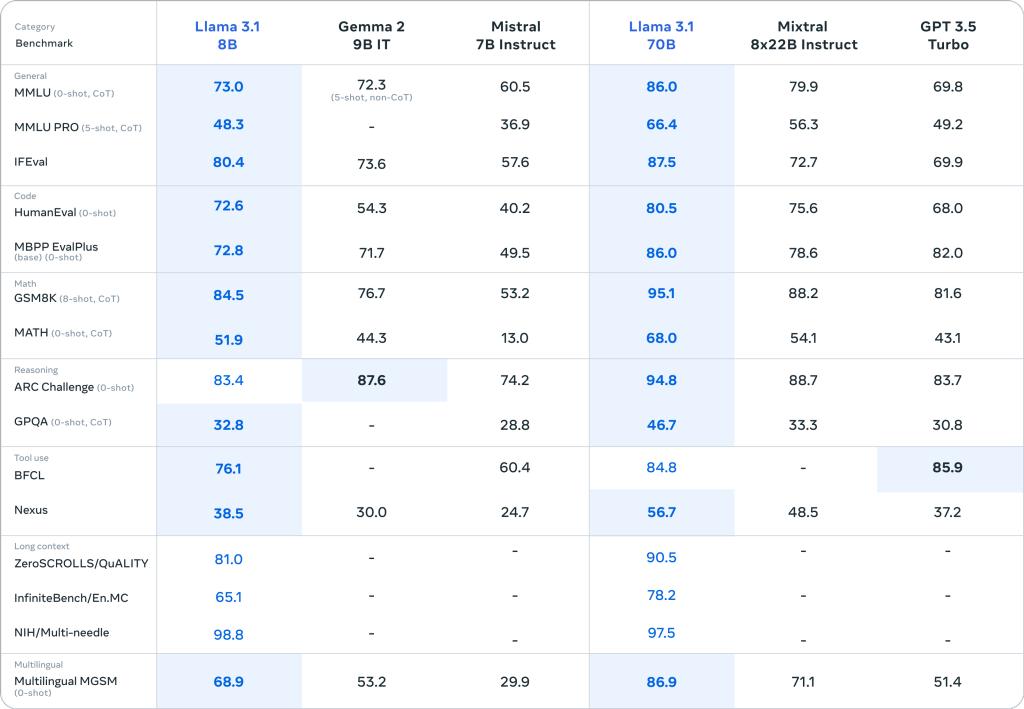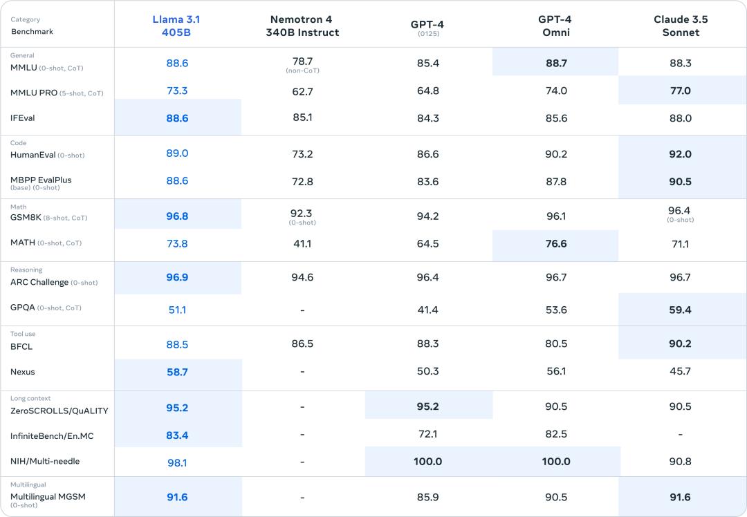 Meta评估了超150个基准数据集的性能,Llama 3.1 405B在常识、可操作性、数学、工具使用和多语言翻译等一系列任务中,可与GPT-4o、Claude 3.5 Sonnet和Gemini Ultra相媲美。