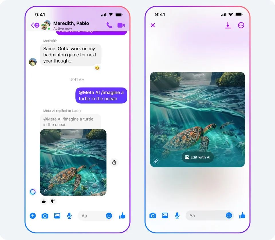 Meta AI将上线“使用AI编辑(Edit With AI)”功能,用户可以通过点击鼠标轻松添加或删除对象,或更改和编辑它们 ,并保持图像的其余部分不变,比如将“将猫改为柯基犬”。Meta AI还将支持将新制作的图片添加到Facebook帖子中,以及Instagram、Messenger和WhatsApp等社交平台上。