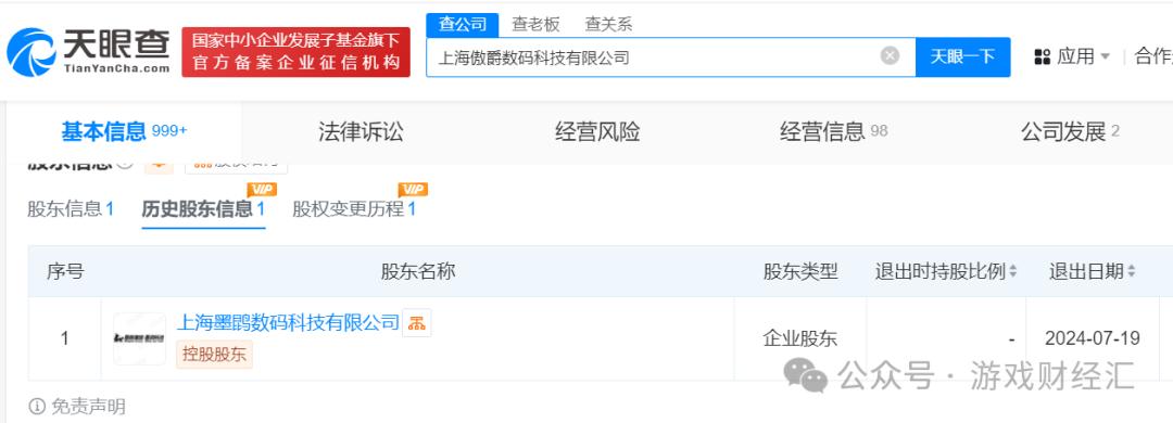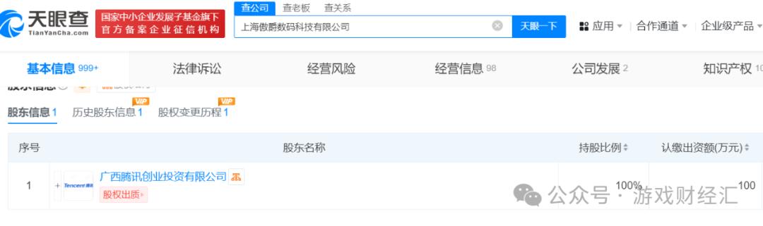 据天眼查显示,近日,上海傲爵数码科技有限公司发生工商变更,原全资股东朝夕光年旗下上海墨鹍数码科技有限公司退出,新增全资股东为广西腾讯创业投资有限公司。
