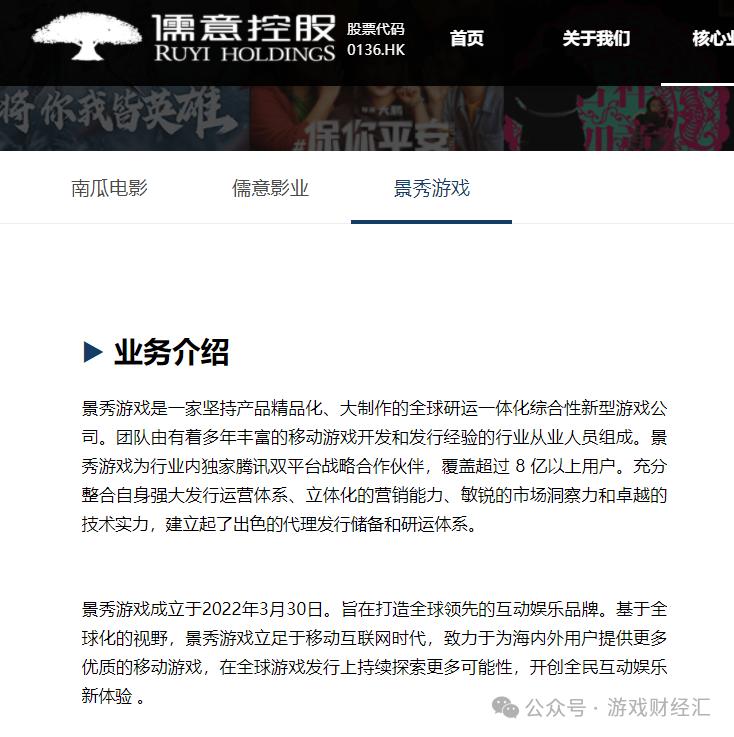 2022年3月,中国儒意进军游戏领域,建立“景秀”品牌,做游戏发行和营销。