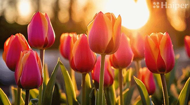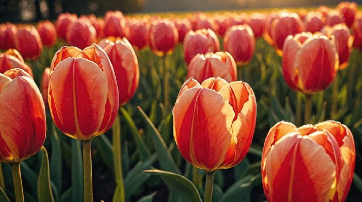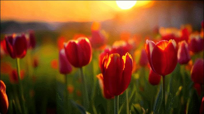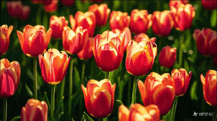 即梦生成的是固定镜头的画面,运动方面以郁金香的晃动为主,整体效果比较稳定。