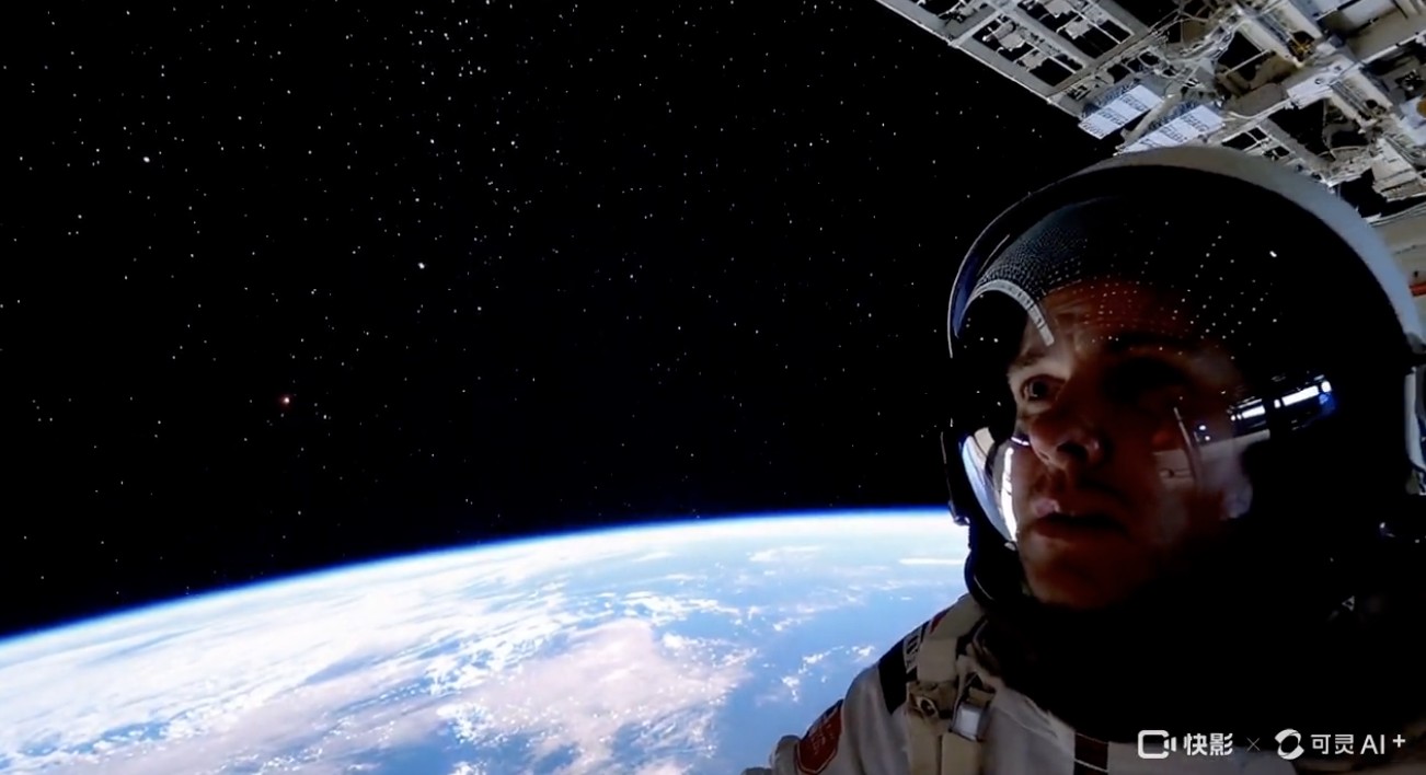 可灵生成的视频画面中一开始没有出现人物,随后宇航员缓慢进入镜头当中,但背景又是静止的,看起来有种淡淡的幽默。不过画面本身的准确度和稳定性还是很高的,体现了每一个关键词,还描绘了部分选手遗漏的“空间站”。