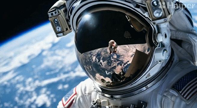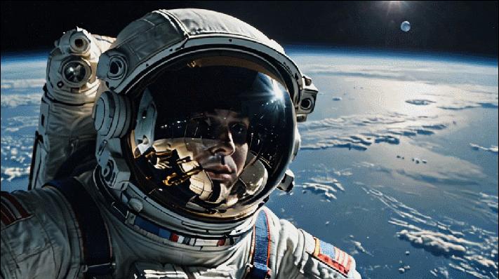 第三关设置为人物特写,使用的提示词为:一个宇航员在空间站外漂浮的特写镜头,背景中有地球和月亮,星星在头盔面罩上反射。