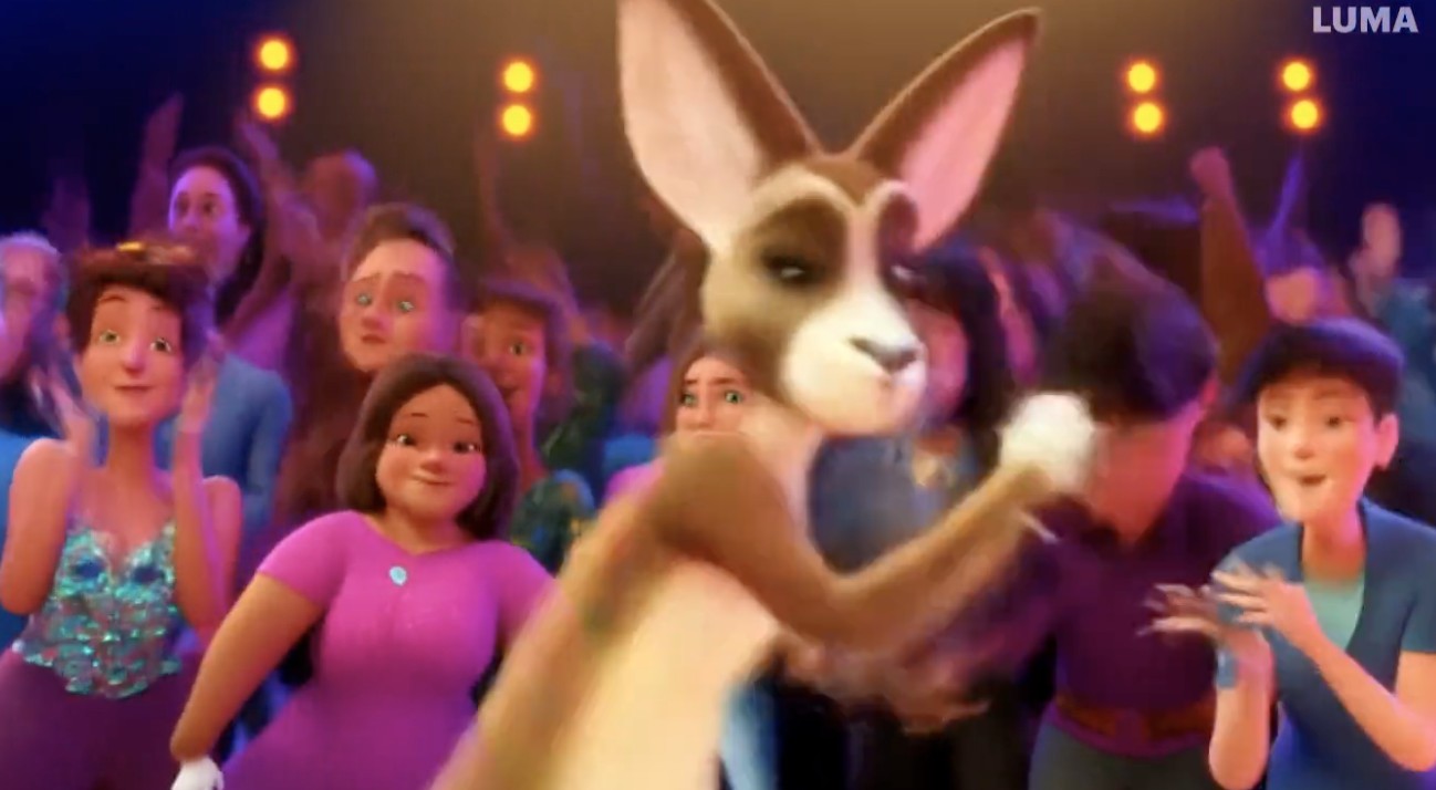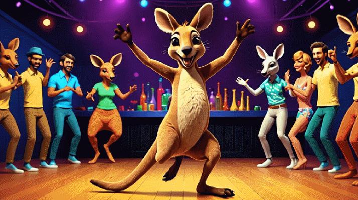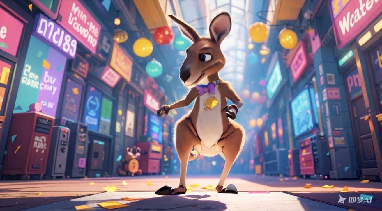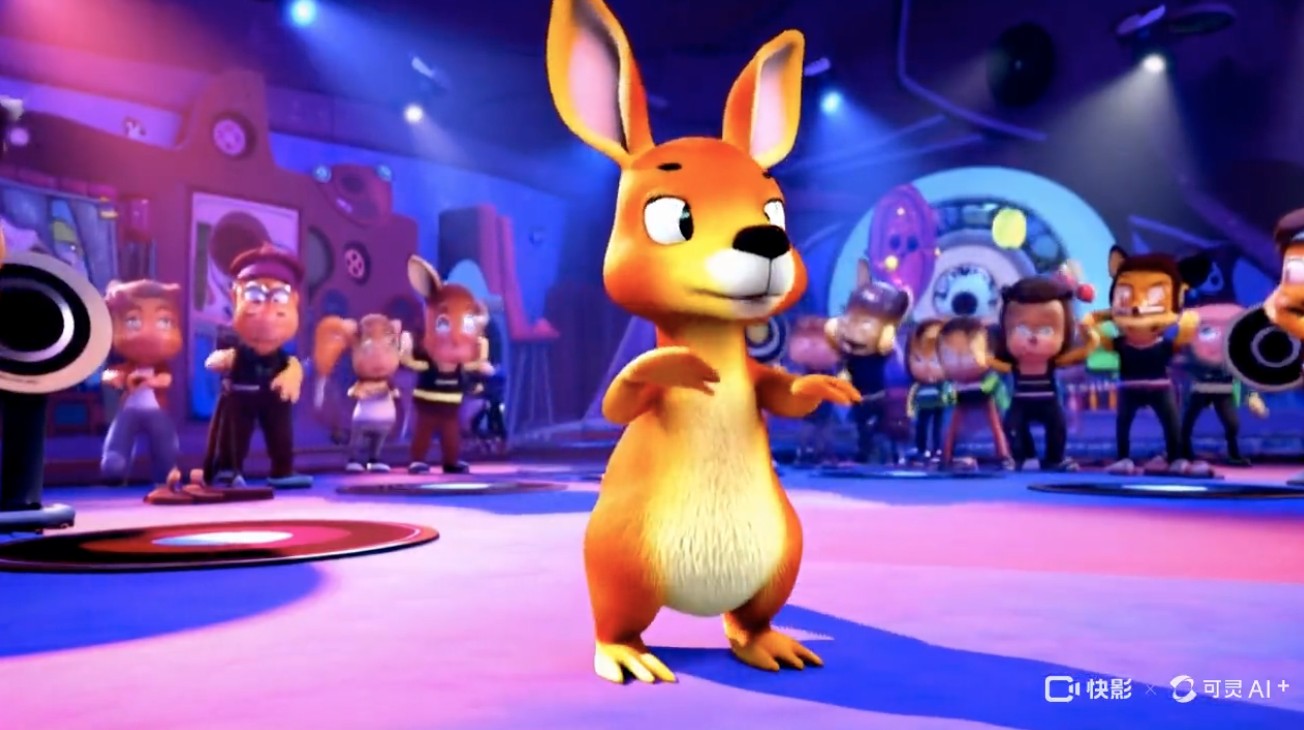 第二关我选择了动物场景,且增加了风格化和动态动作的元素,提示词为:一只卡通袋鼠在跳迪斯科。这其实是Sora提供的案例中的一个,首先我们来看一下Sora的打样。
