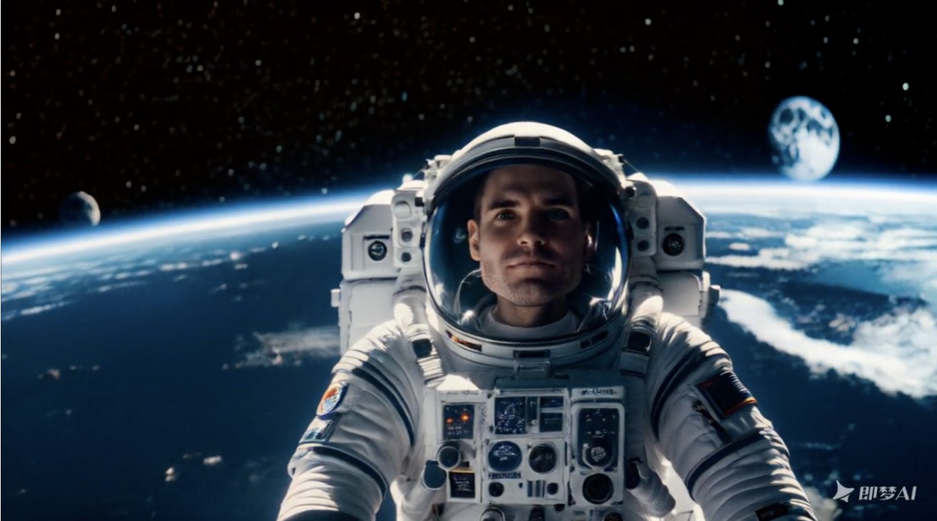 即梦在人物细节的刻画上较为优秀,人脸、服装都比较精致,稳定性也很高,但是画面背景中似乎出现了第二个“地球”,此外镜头相较于“特写”更偏向“近景”。