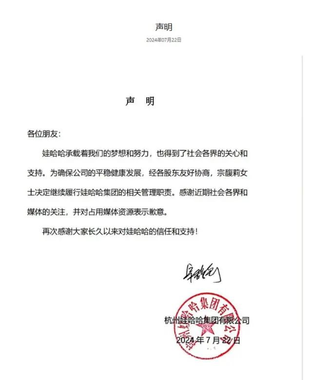 7月22日,除了宣布宗馥莉继续履职,娃哈哈还表示,感谢近期社会各界和媒体的关注,并对占用媒体资源表示歉意。