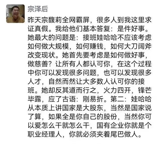 一周前,宗馥莉发出请辞信后,她的叔叔宗泽后公开称“辞职是件好事。宗馥莉最大的问题是接班娃哈哈后不应该考虑如何做大规模,如何赚钱,如何大刀阔斧改变现状,而是应首先考虑如何做好事、做慈善,让所有人都认可......”