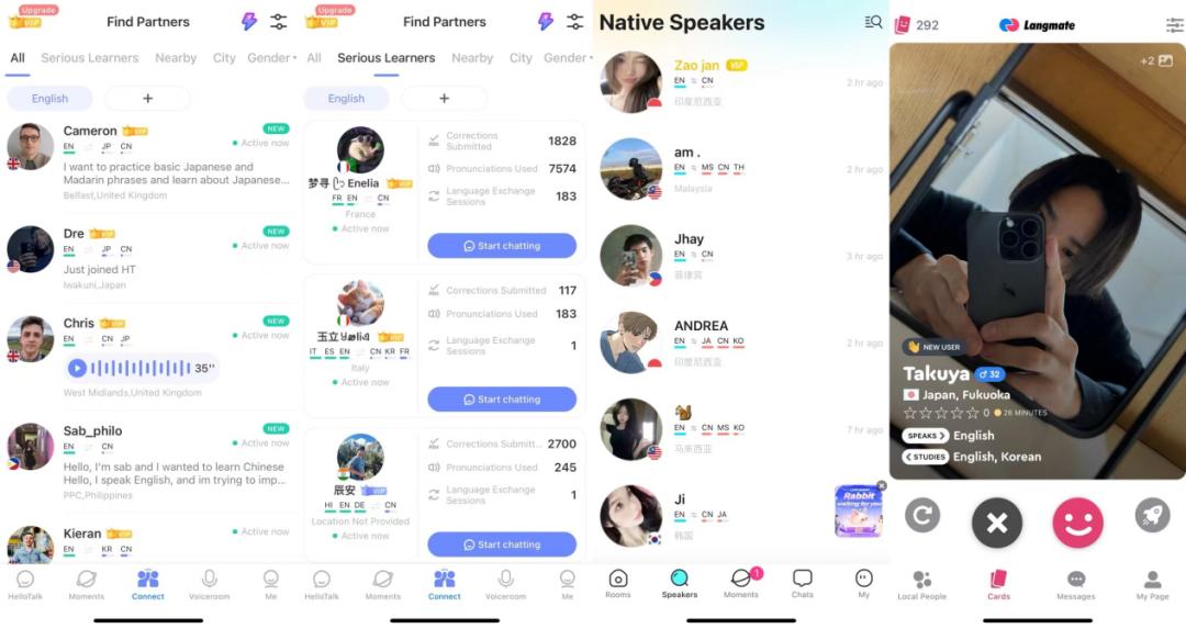 左 1 左 2 为 HelloTalk、 左 3 为 YeeTalk、左 4 为 Langmate