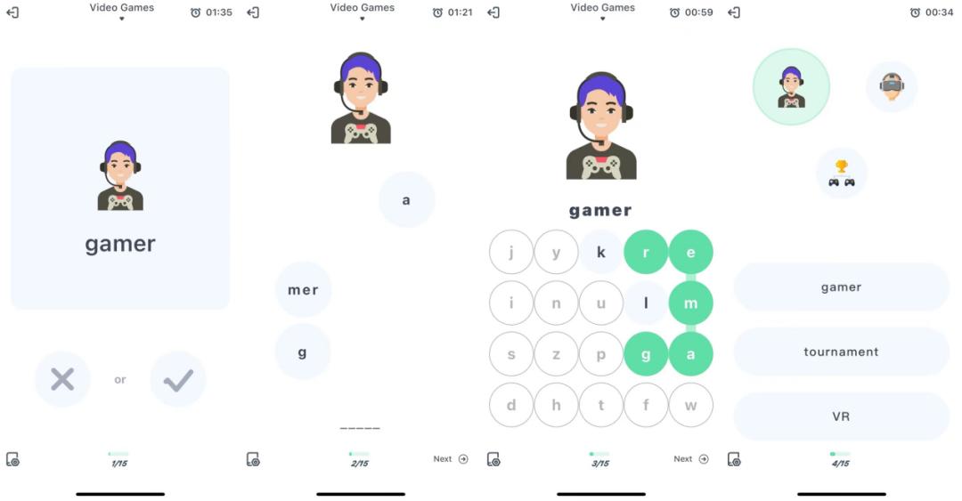 课程会通过图片、判断、连线、拼写、对应等多种方式帮助用户了解主题词汇,并在语句中进行实际应用。