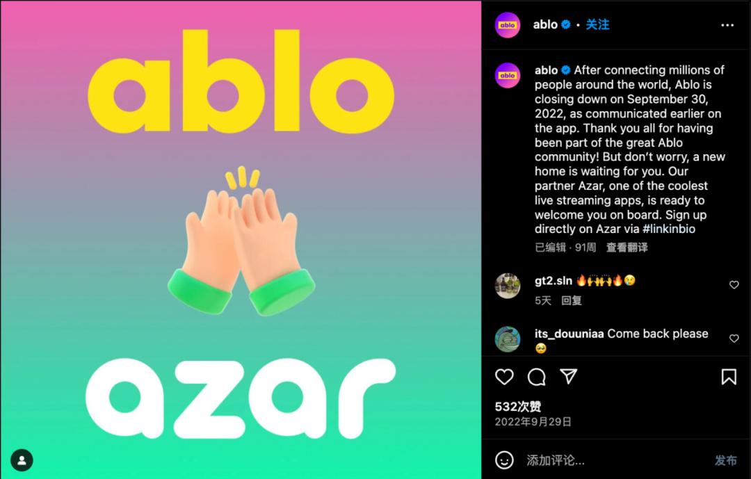 而且就在 Ablo 下线前的倒数第二天,官方还发布了 Instagram 动态给 Azar 引流,也算发挥了 Ablo 最后的光和热。