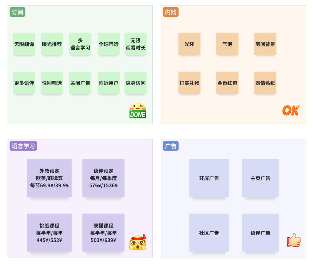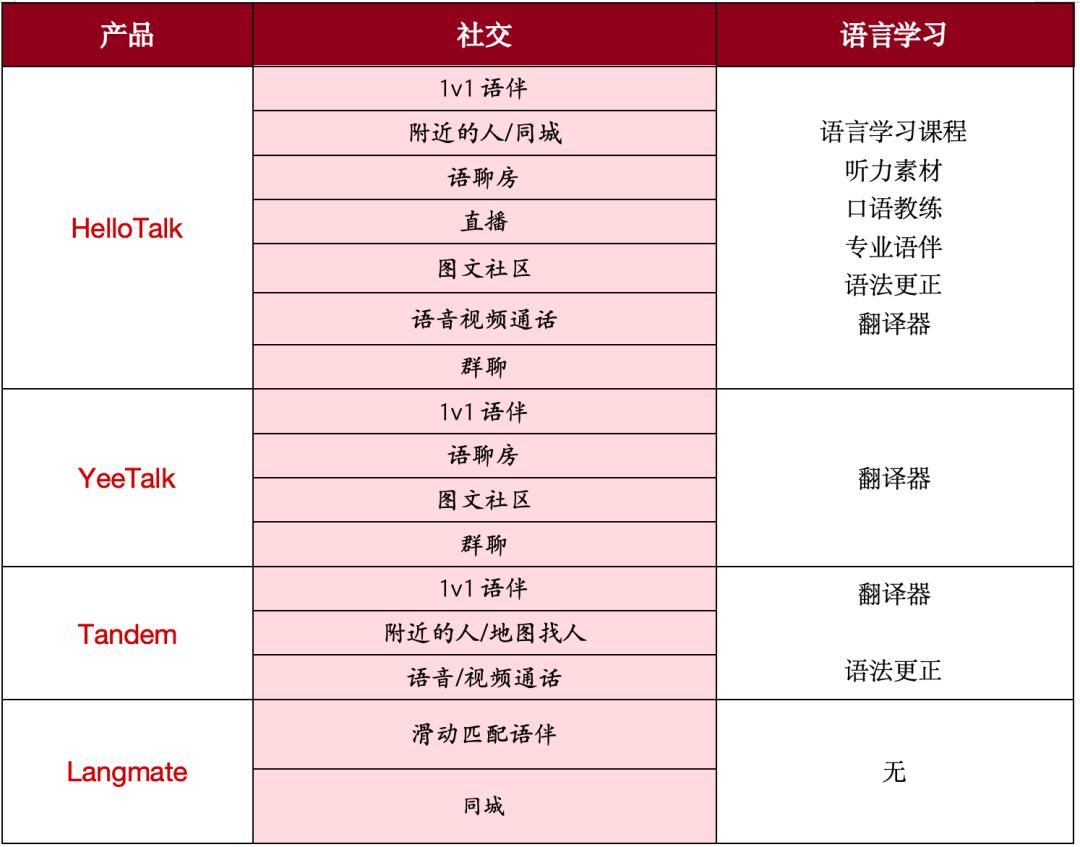这其实是个不低的要求。用户增长方式,在上文已经讨论过了,下面我们主要从产品的角度分析 4 款语言学习类社交产品提供的服务。