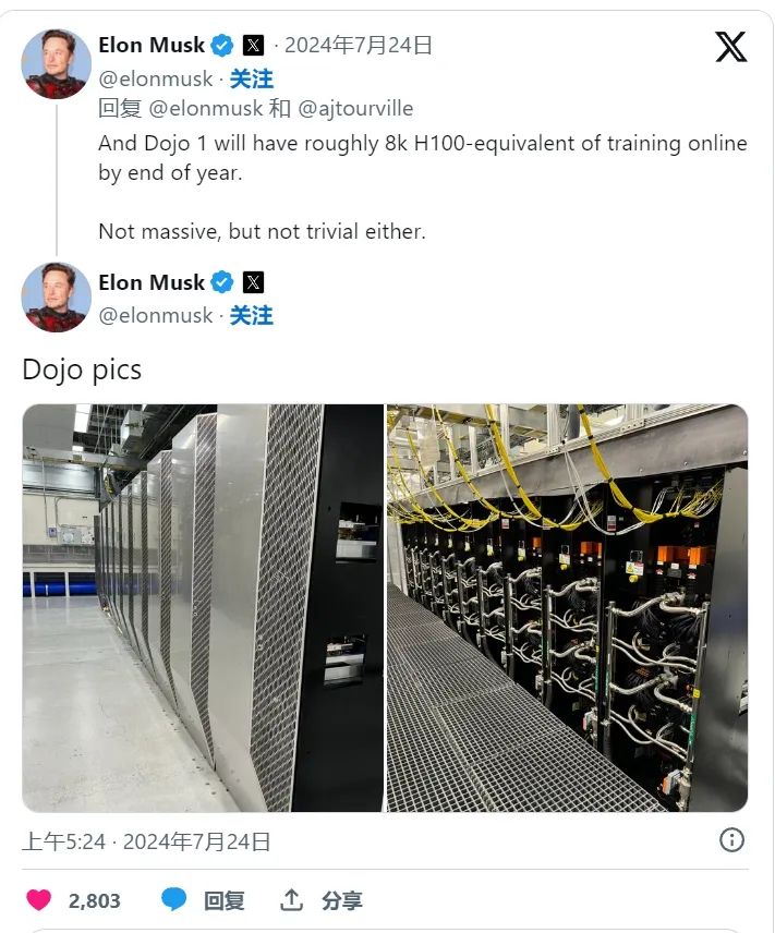 当天早些时候,马斯克在推特上写道:“到今年年底,Dojo 1号将提供相当于大约8000个H100的线上训练量。不是很大,但也不是微不足道。”