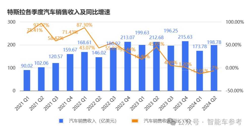 财报显示,二季度汽车销售收入为198.78亿美元*(折合人民币约1446.24亿元)*,同比下滑7%,环比上升14%。