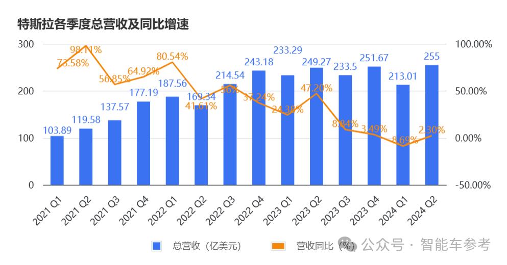 不过,虽然汽车销售收入表现欠佳,但同期特斯拉的总体营收却上涨,达到了255亿美元(折合人民币约1855.28亿元),超出预期的246.3亿美元(折合人民币约1791.98亿元),同比增长2.3%,环比增长19.71%。