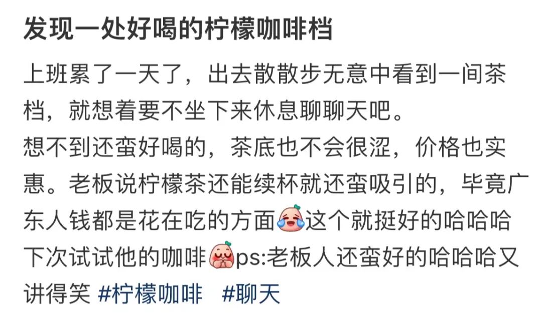于是,在童年夜生活回忆的加持下,柠檬茶档成为了广州年轻人找地方“hea下”(随性地打发时间)的首选。