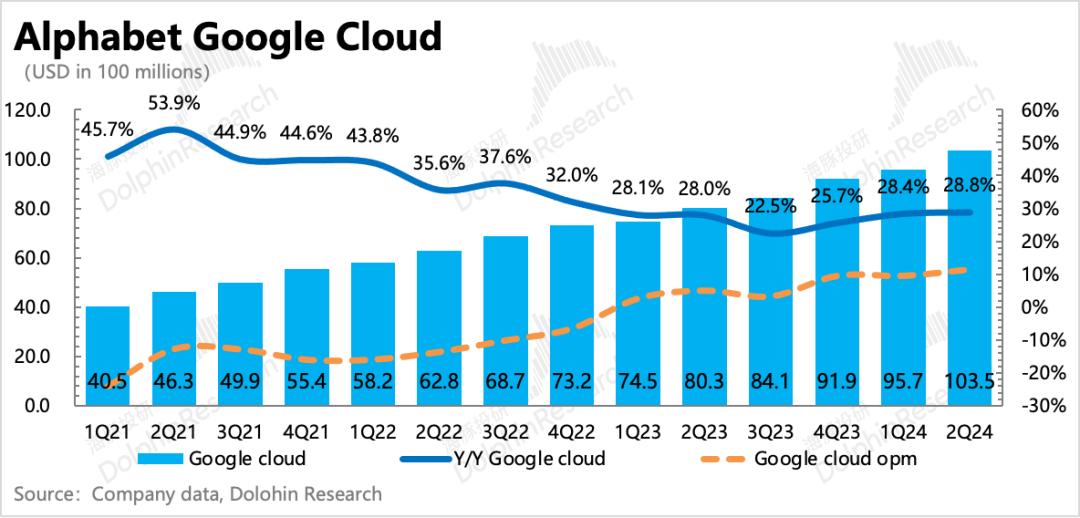 从业务角度划分,Google Services经营利润率上浮了0.5pct。Google Cloud业务也重新开启盈利改善的节奏,OPM环比提升2pct。而这两块在财报前市场出于对AI成本增量的考虑,虽然也预期还会进一步改善,但都不算高。
