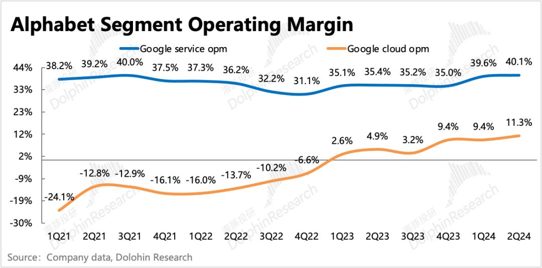 以广告为主的Google Services和Google Cloud两大业务部门,二季度经营利润率均有提升,其中云部门的盈利改善显著超出市场预期,Google Services的经营利润率也小幅提升到近三年新高。