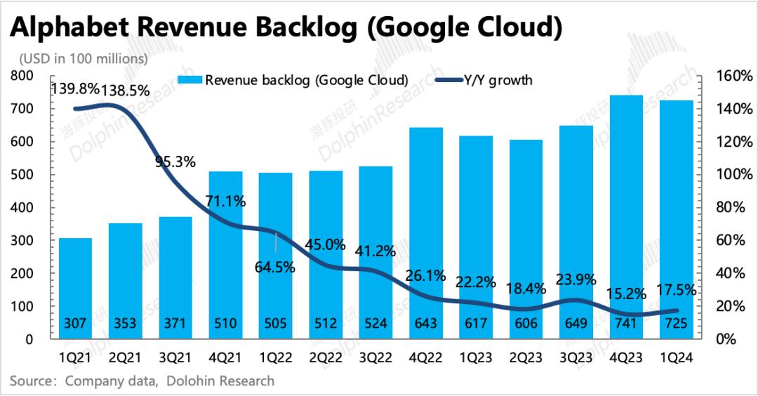 因此海豚君一般还是会通过谷歌的Revenue Backlog指标来判断短期趋势。这个指标中大部分是来自云业务,因此它的变化趋势也可以视作云业务的未履约合同量的变化趋势。