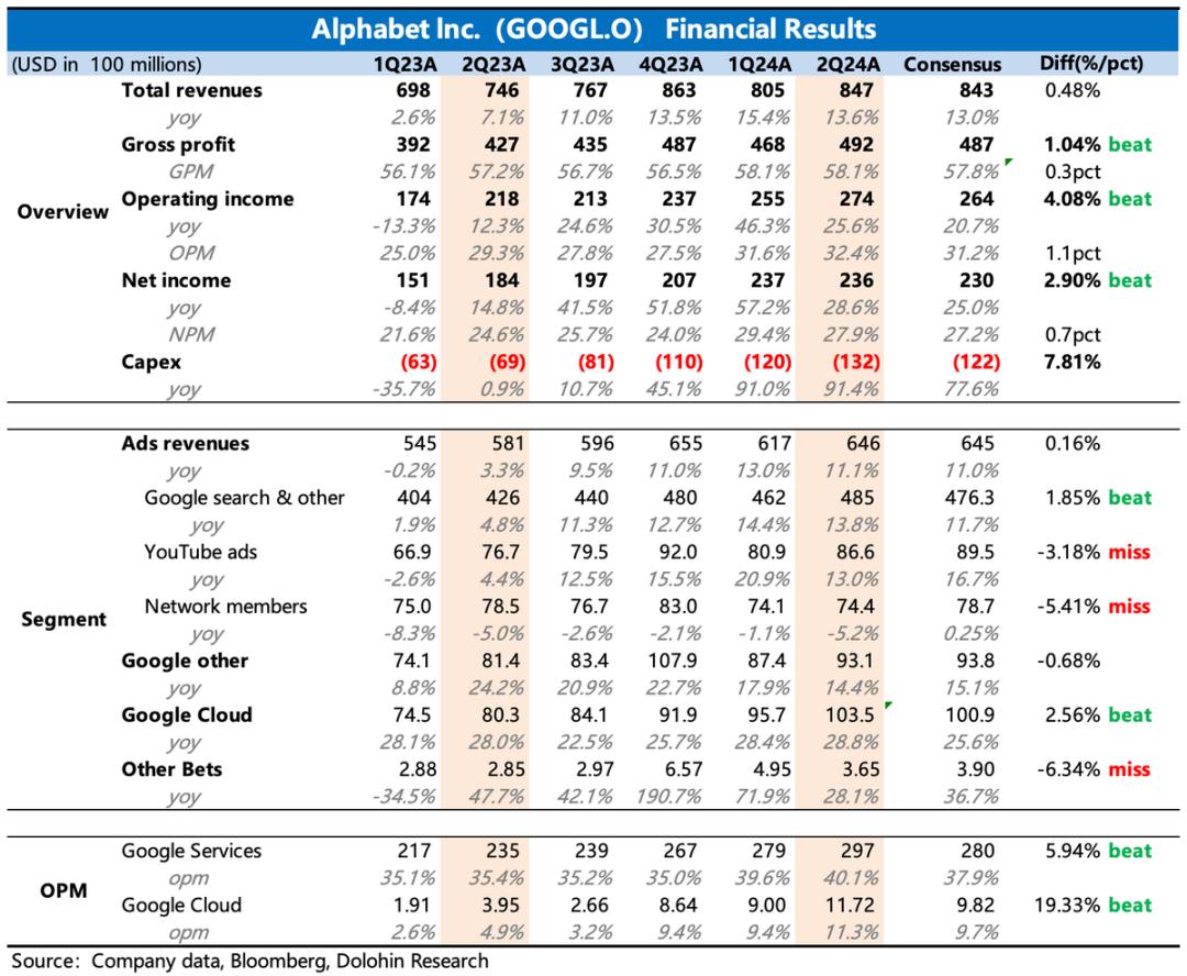 二季度谷歌整体营收847亿,同比增长13.6%,基本符合市场一致预期。