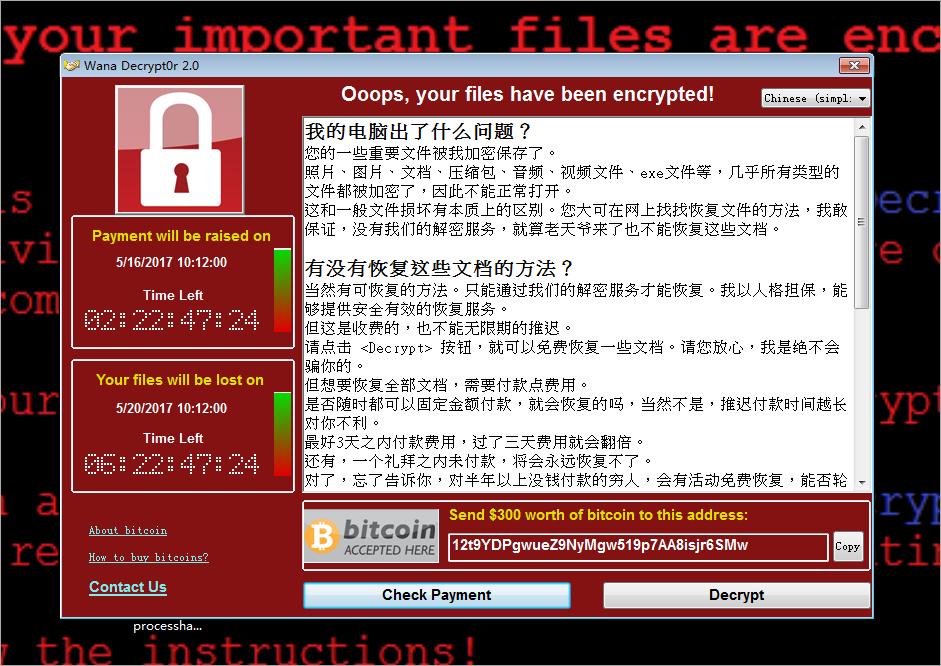 2017年,一款名为WannaCry(想哭)的蠕虫式勒索病毒就在中国等多个国家的企业、学校、医院等地爆发并蔓延,这种病毒会强力封锁电脑中的文档、图片和程序,索取用户以比特币支付的赎金。多行业因此受到影响。