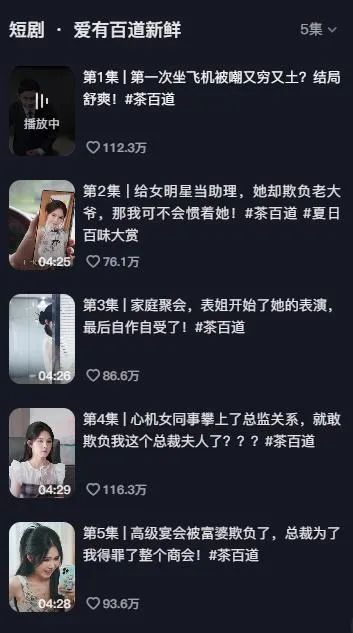 由品牌主导剧情,将主角、重要人物的剧情背景与品牌强相关,让观众在不知不觉中了解品牌理念、建立品牌好感。有的“定制”甚至从剧名就能看出来,比如抖音平台上播放的茶百道定制短剧《爱有百道新鲜》,其剧情故事围绕在茶百道工作的女主@姜十七身上展开,这部仅五集的短剧收获了3.6亿+播放量和480万+的点赞量。