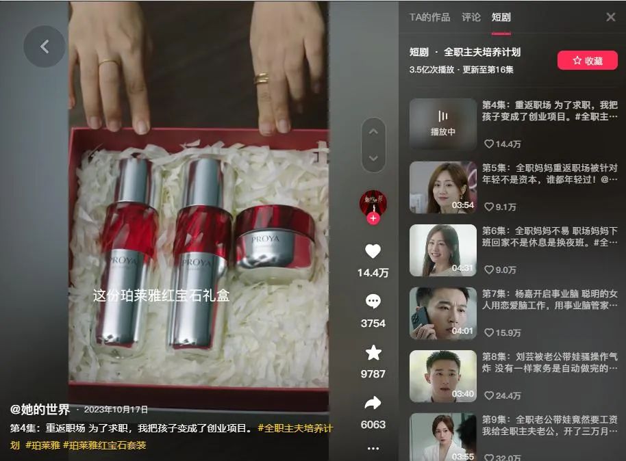 珀莱雅更是赞助了短剧《全职主夫培养计划》。短剧中巧妙地植入了珀莱雅的产品,如“红宝石套装”,通过特写镜头和剧情引导,促进了产品销售。在双11期间,珀莱雅力压欧莱雅、兰蔻、雅诗兰黛等一众国际品牌,摘得“天猫美妆行业双11”全周期品牌榜桂冠,这在一定程度上得益于《全职主夫培养计划》的营销效果。