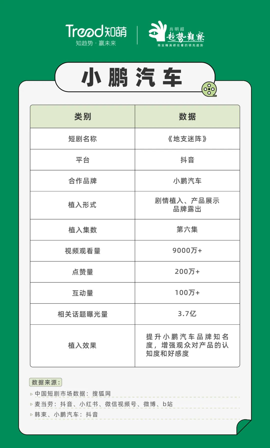 小鹏汽车在其P7特别纪念版暗夜骑士发布时,巧妙地将车型植入抖音短剧《地支迷阵》的第六集。将车型作为主角柳夜熙出任务时的专属座驾,实现了产品的精准曝光。短片点赞数突破200万,播放量高达9000万次,互动量超过100万,相关话题曝光量达到惊人的3.7亿。